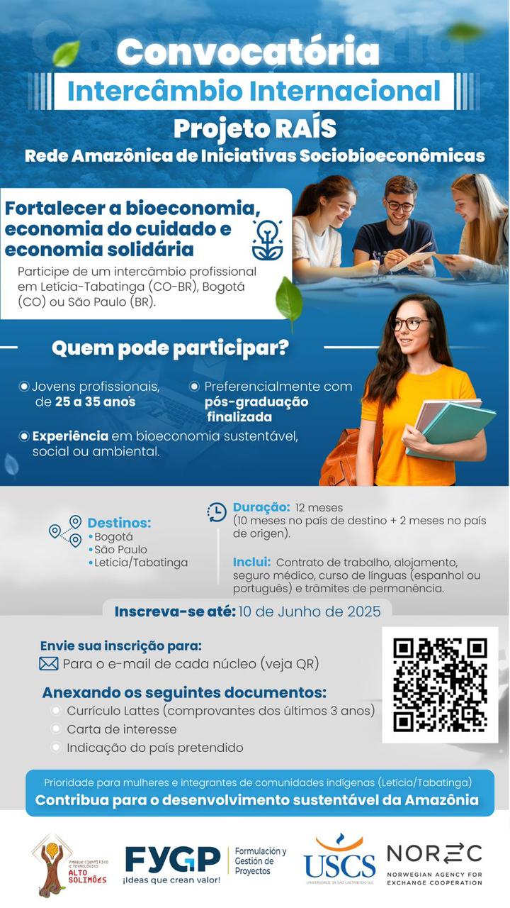 É com alegria que compartilhamos a publicação da Convocatória de Intercâmbio Internacional do Projeto RAÍS: Rede Amazônica de Iniciativas Sociobioeconômicas, para divulgar a quem possa interessar, a possibilidade de participar de um intercâmbio entre São Paulo/Bogotá/Tabatinga/Letícia.